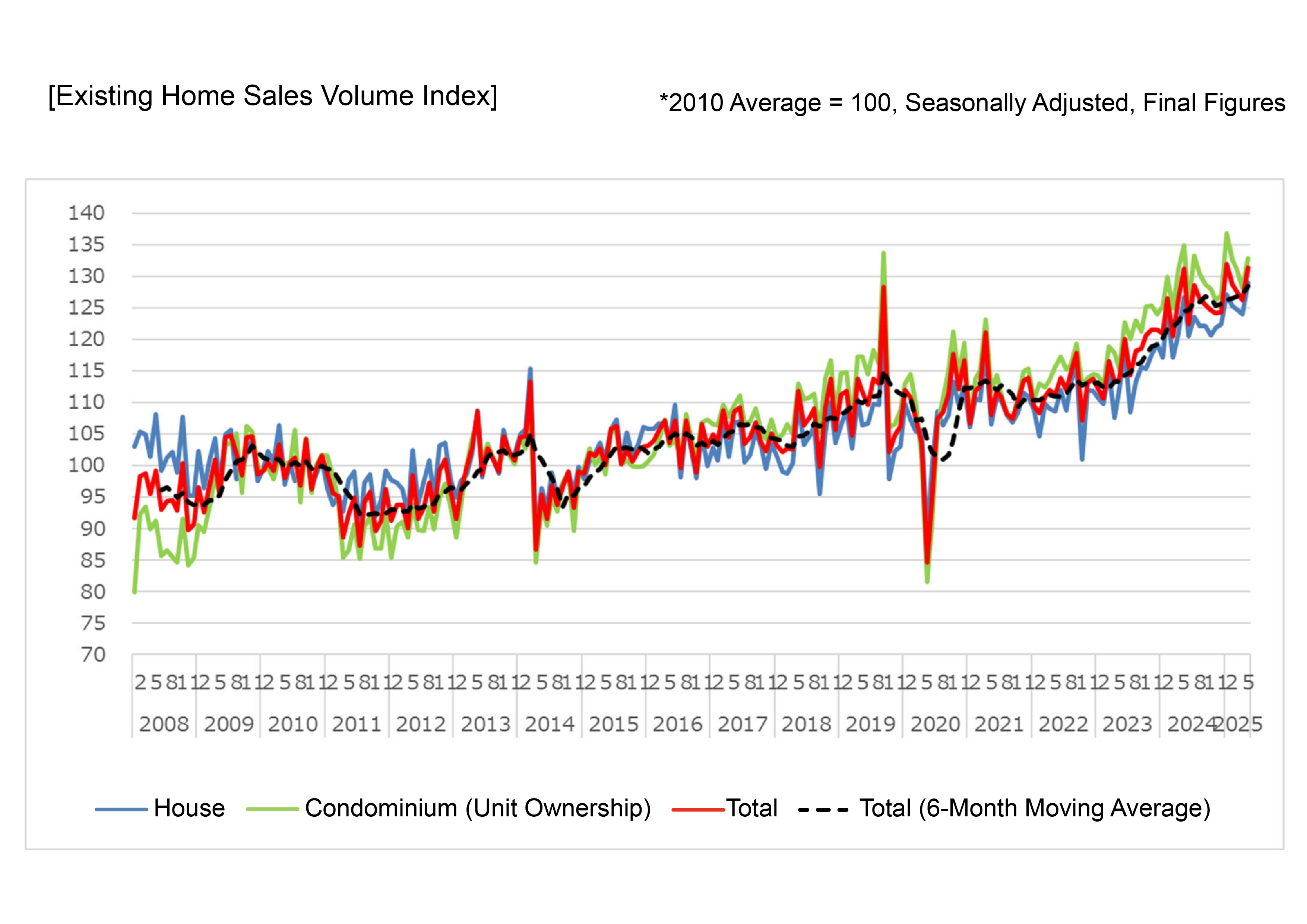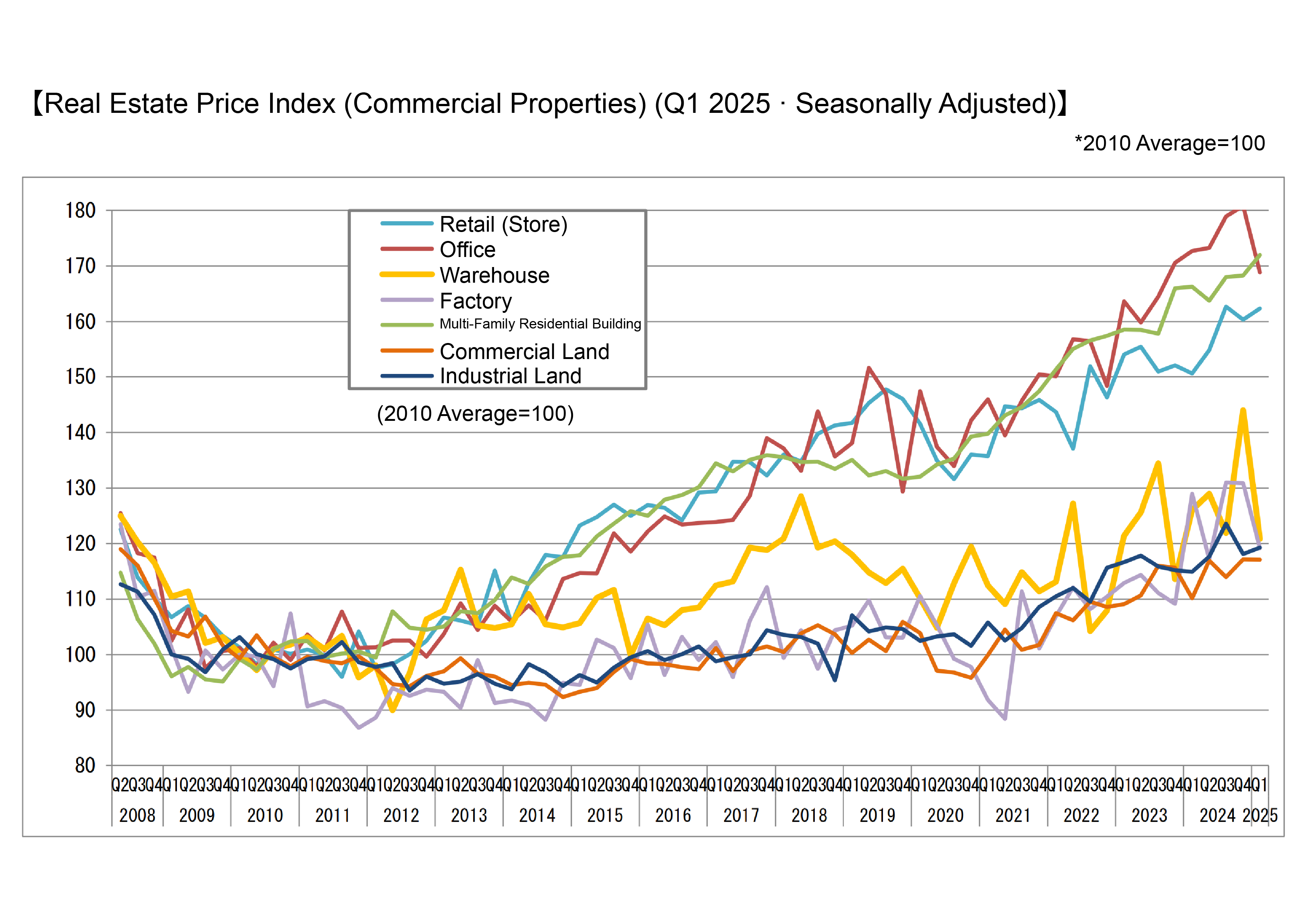 The May 2025 Existing Home Sales Volume Index and Q1 Real Estate Price Index indicated a moderate nationwide recovery. Condominium markets were particularly strong, with notable growth in major metropolitan areas such as Tokyo and Osaka. Conversely, commercial real estate showed weakness in the office sector, highlighting divergence across asset classes.