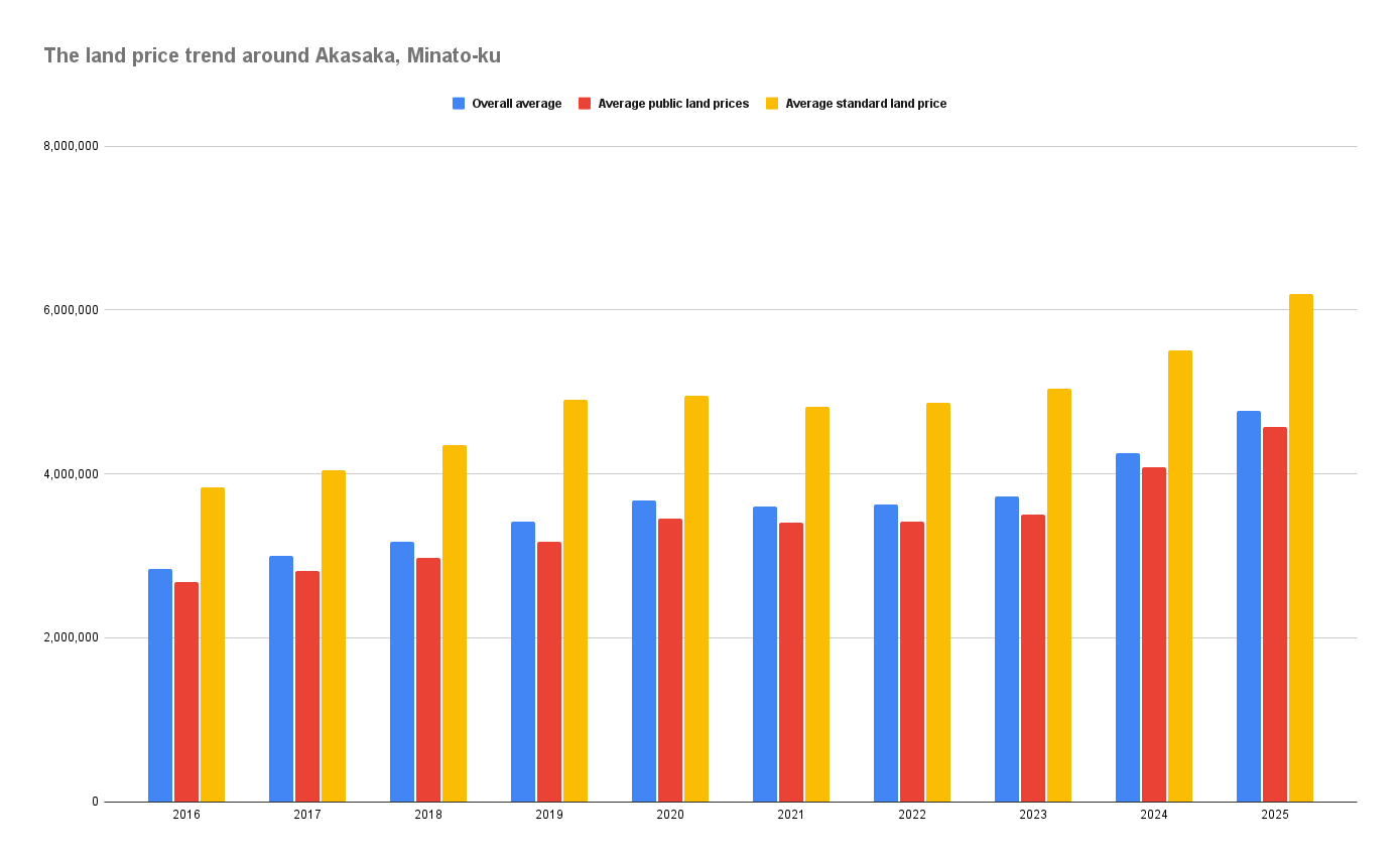 In 2025, the average land price in the Akasaka area (based on official and standard land prices) reached ¥4.775 million per square meter, approximately ¥15.78 million per tsubo, +12.16% increase year-on-year.
