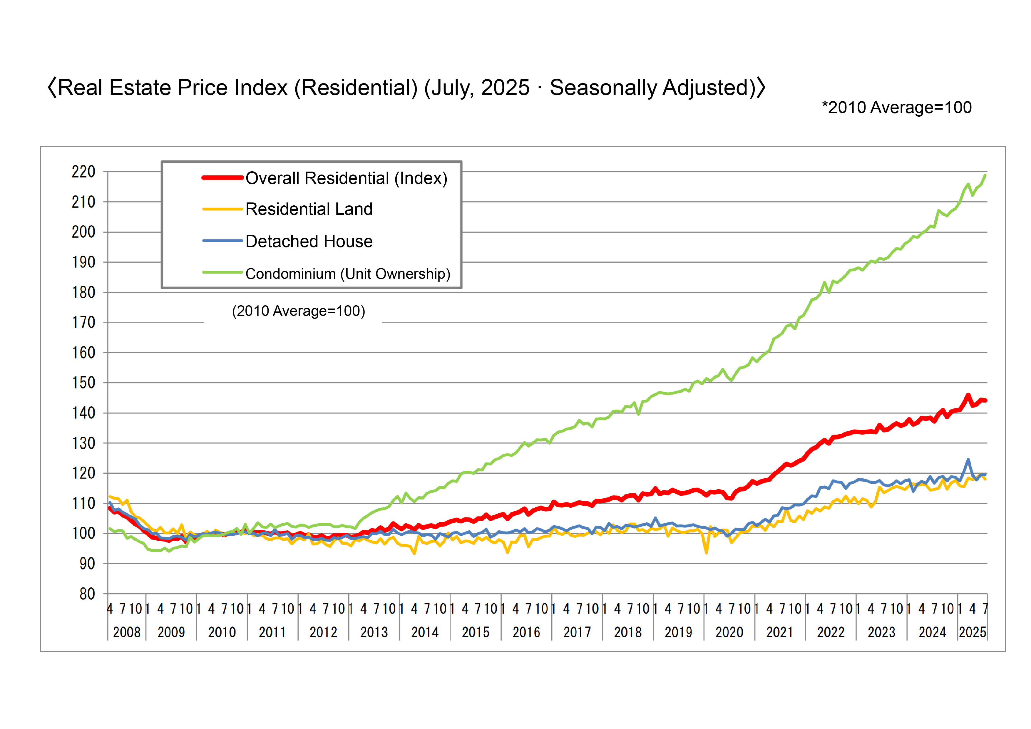 In the Kanto area, the composite residential index rose to 152.6 (up 0.8%), driven by condominiums at 215.3 (up 2.0%).