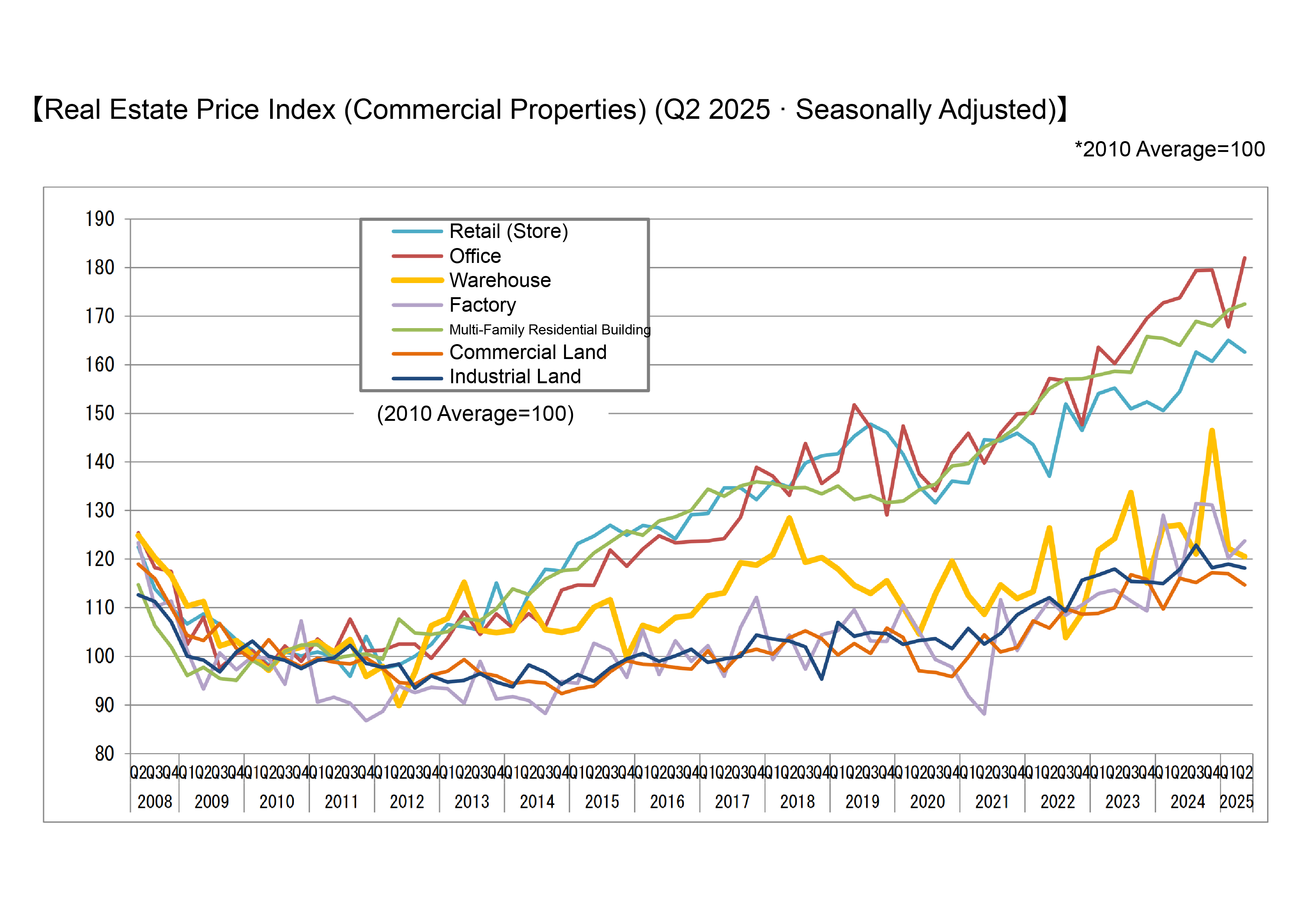 The Commercial Real Estate Price Index rose 0.6% to 145.1. By category, offices surged 8.4% to 182.0, reflecting revived corporate demand in major cities, while stores declined 1.5% to 162.6.