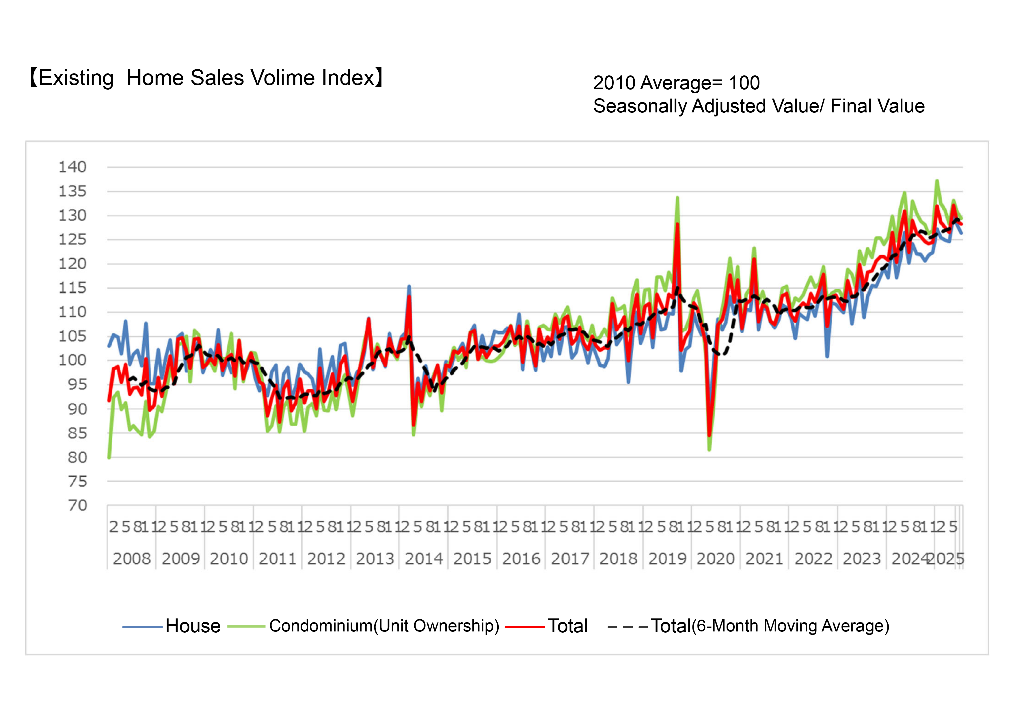 According to the Ministry of Land, Infrastructure, Transport and Tourism, Japan’s Existing Home Sales Volume Index for July 2025 (seasonally adjusted) was 128.3, down 0.4% from the previous month, showing a slight nationwide decrease. Excluding units under 30m2, the total index was 116.4 (down 1.4%), indicating a slowdown in both detached house and condominium transactions.