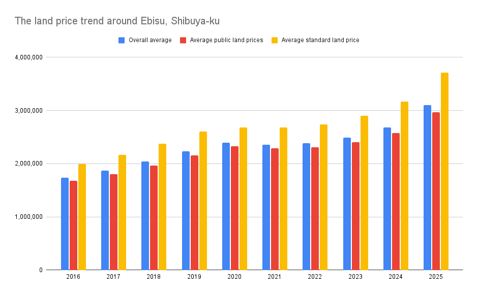 In 2025, Ebisu’s land price hit around 11.87 million yen per mat, marking a significant 15.1% yearly increase and reflecting strong upward pressure on district-wide land values.