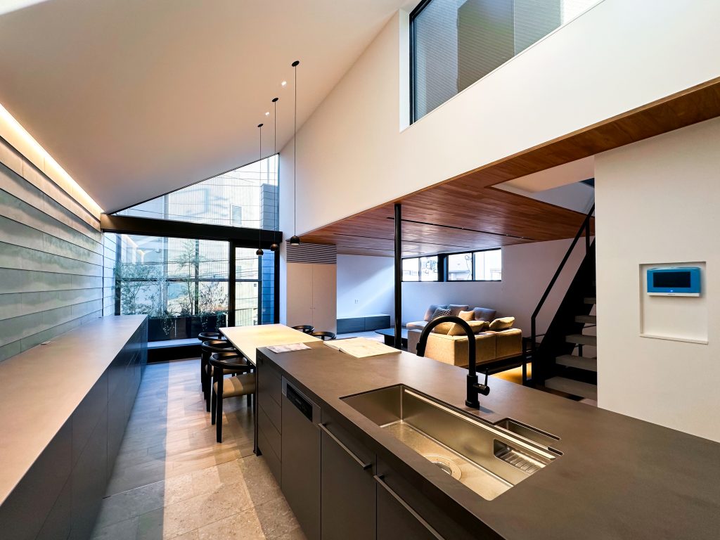 The spacious Living & Dining Kitchen, measuring 31.2 tatami mats (51.5㎡), features a double-height ceiling that provides an open view to this area, enhances natural light throughout the space and creates a luxurious, airy, and dramatic atmosphere.