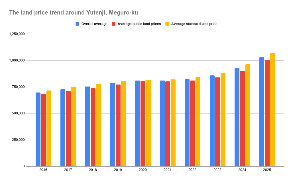 Yutenji station area: Approx. ¥1,030,142/㎡ (+11.19% year-on-year)
