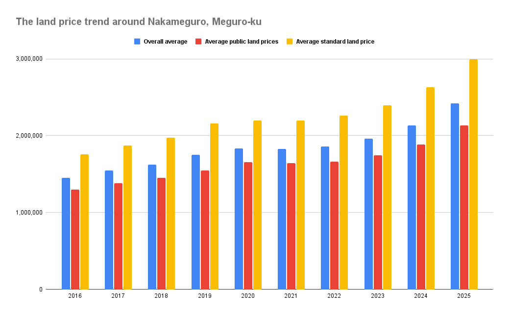 Nakameguro area: Approx. ¥2,422,222/㎡ (+13.56% year-on-year)