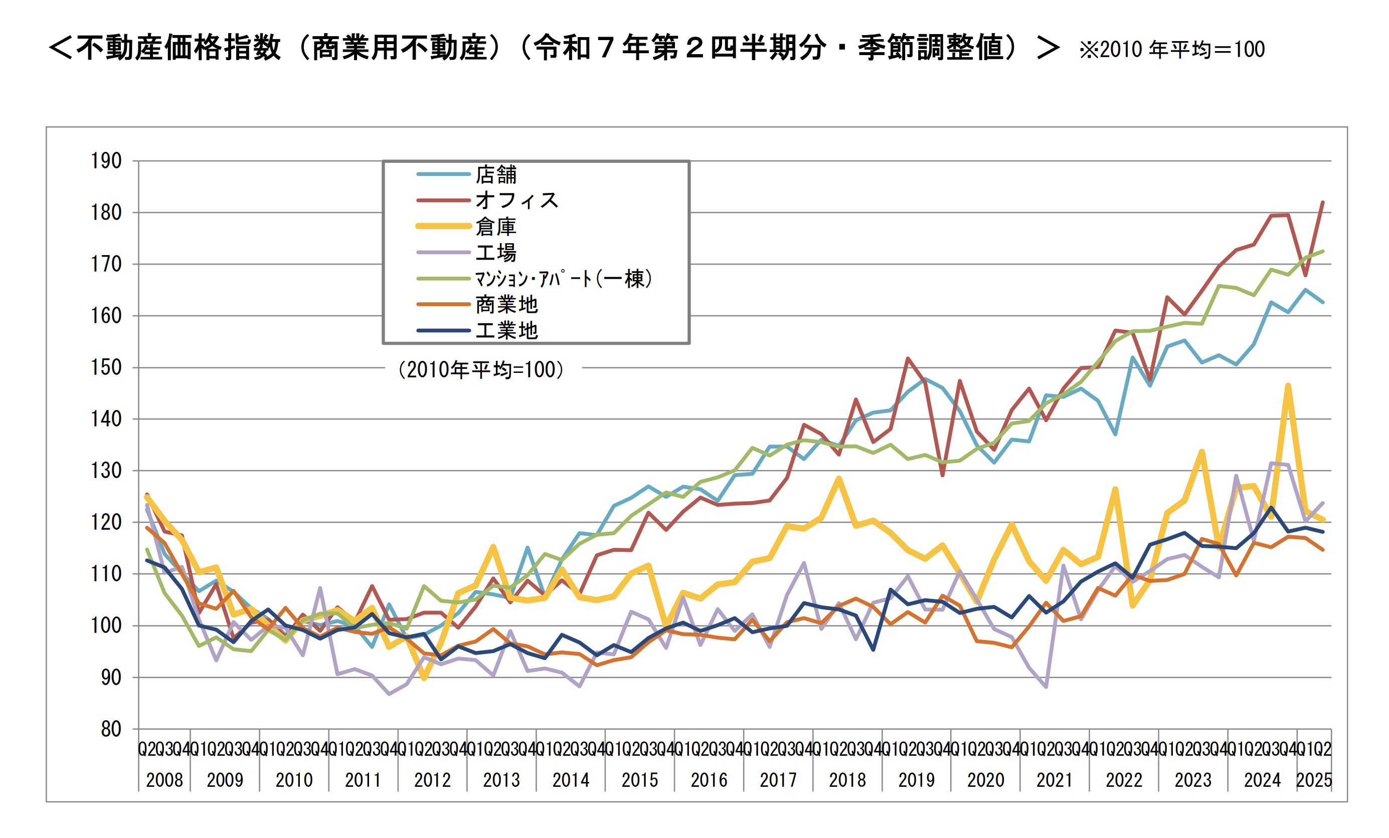 商業用不動産価格指数(季節調整値)は145.1(前期比0.6%増)と上昇を維持。用途別では店舗162.6(1.5%減)と調整したが、オフィス182.0(8.4%増)と大幅上昇し、主要都市での企業需要回復が価格を押し上げた。一棟マンション・アパート172.5(0.7%増)も堅調。
