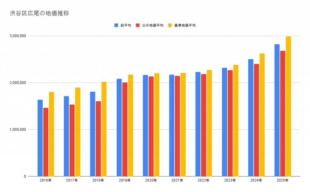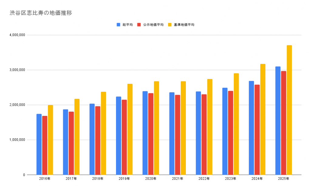 近年、広尾・恵比寿の両エリアでは地価の上昇が際立っています。
