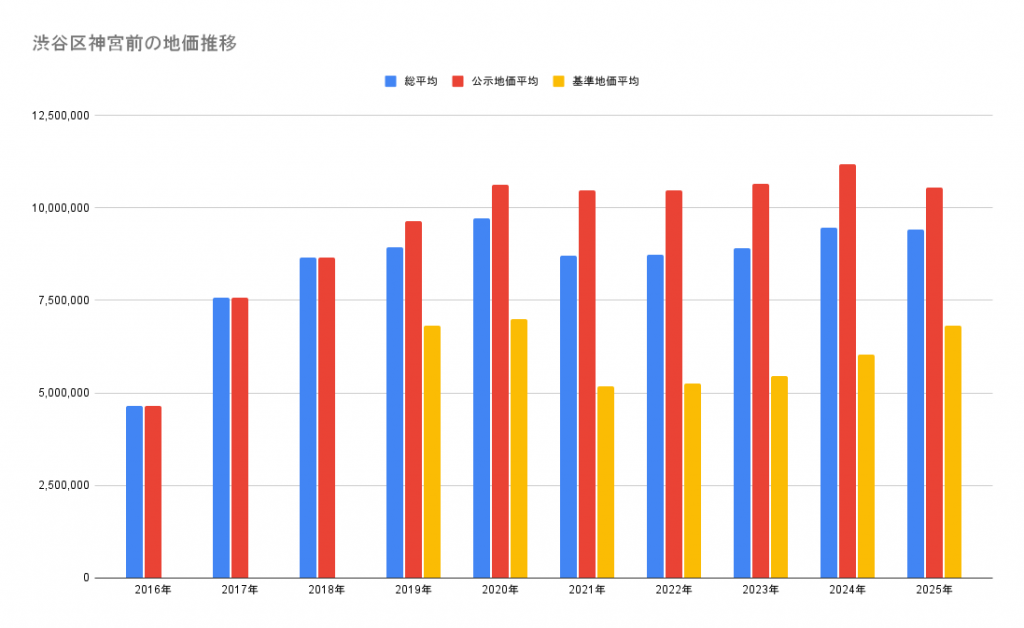 神宮前エリアは、近年地価が安定的に上昇している地域です。2025年の公示地価データによると、神宮前の地価の総平均は1㎡あたり約942万4000円で、前年からの平均変動率は+ 11.72%の上昇です。都心有数のブランドエリアとして資産価値の堅調さを示しています。