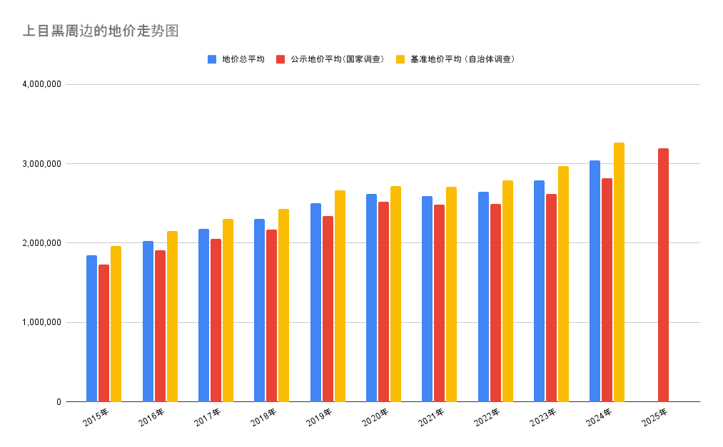 上目黑4丁目周边是中目黑最有人气的区域。参考近年来的地价公示表,2024年(令和6年) (附近地区的平均价格)的地价每平米约200到210万日元之间,比去年上升了好几个百分点。这是因为,近年来,中目黑周边的大开发项目和商业区域受到关注,因而地价缓慢上升。