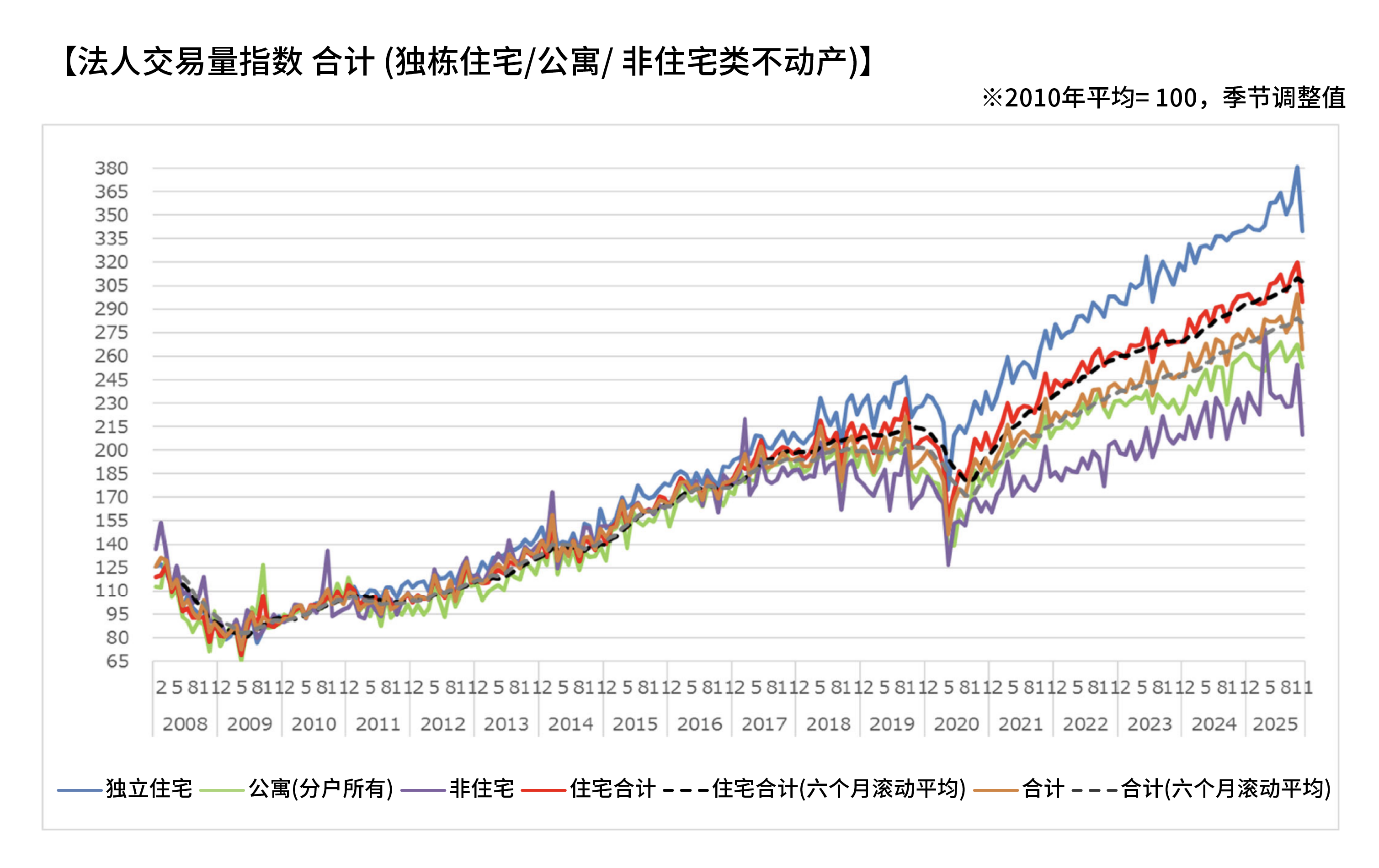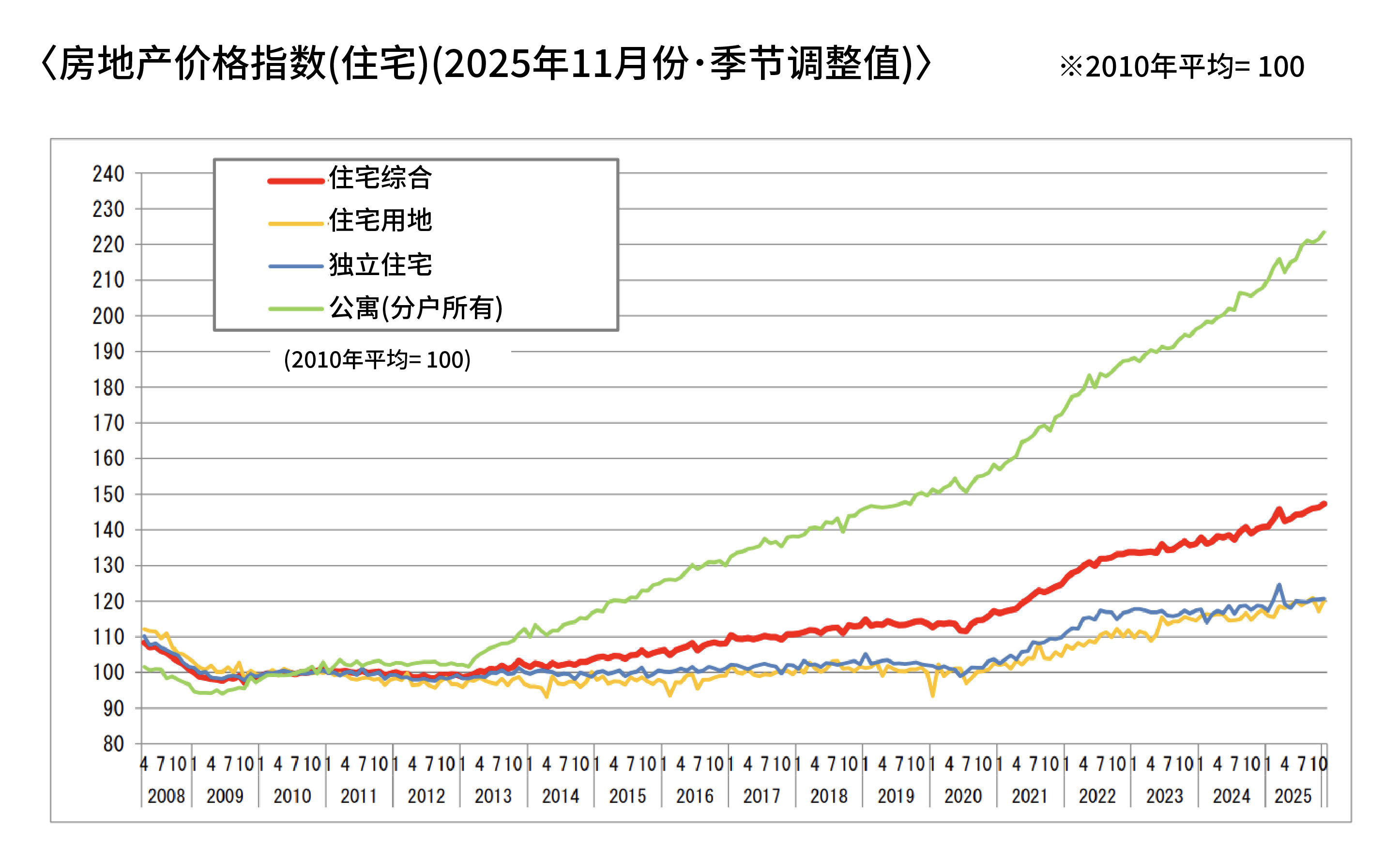根据2025年11月发布的房地产相关统计数据,日本住宅市场出现了一个明显的趋势:交易量下降,但房价仍然上涨。数据显示,在二手住宅成交量指数中,全国交易量出现下降,但房地产价格指数显示住宅价格仍在上升,市场呈现出“交易量下降”与“价格上涨”同时发生的情况。