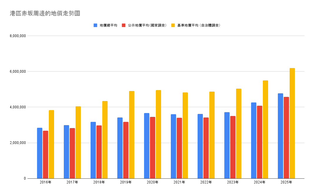 2025年(令和7年),赤坂地區的平均地價(綜合公示地價與基準地價)已達每平方米477.5萬日元,相當於每坪約1,578萬日元,前年比共上漲了12.16%。