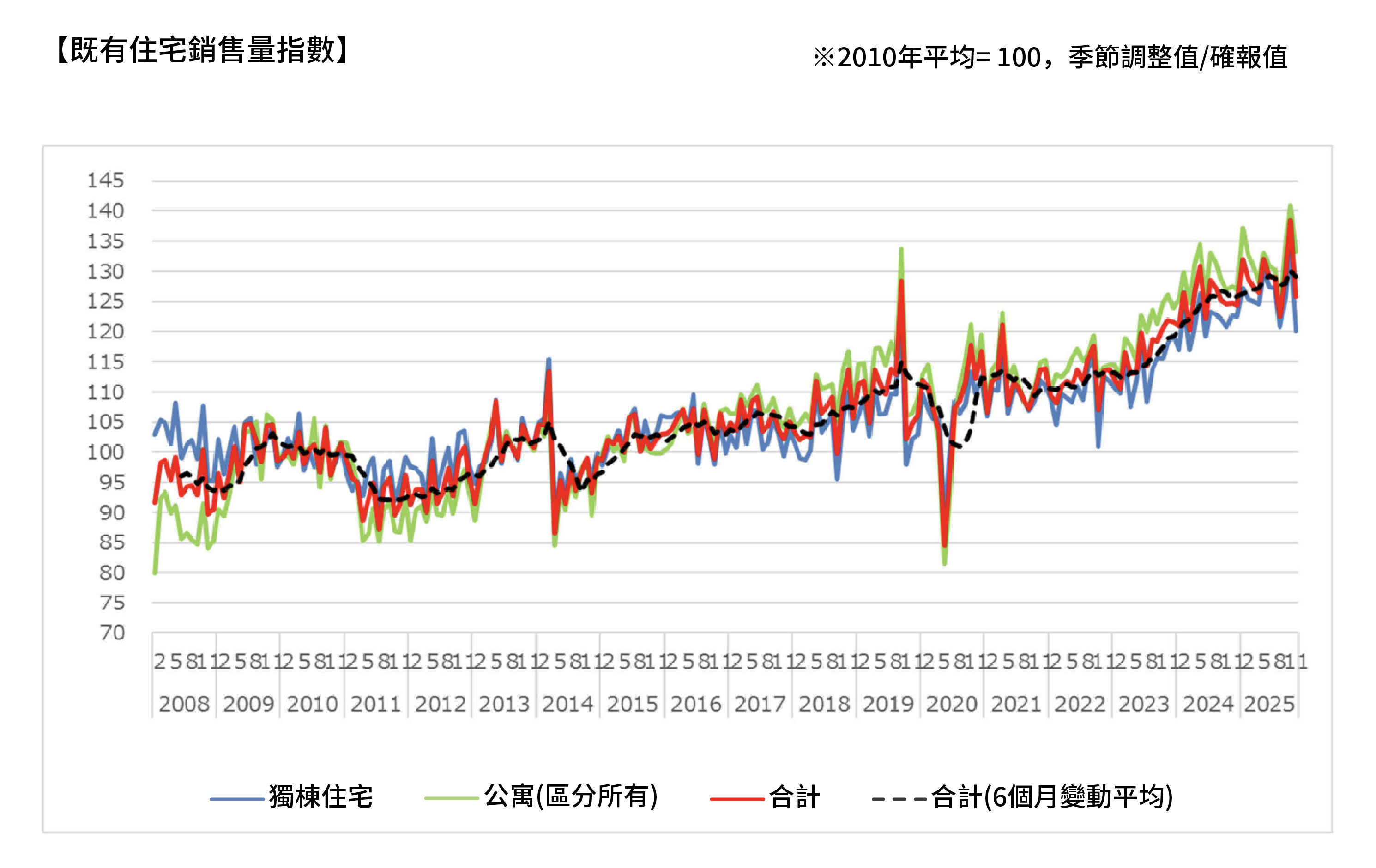 根據2025年11月公布的不動產相關統計,日本住宅市場出現一項顯著趨勢:交易量下降,但房價仍持續上升。既有住宅成交量指數顯示,全國交易量有所減少;然而不動產價格指數則顯示住宅價格持續上升,使市場呈現出「交易量減少」與「價格上升」同時發生的情況。