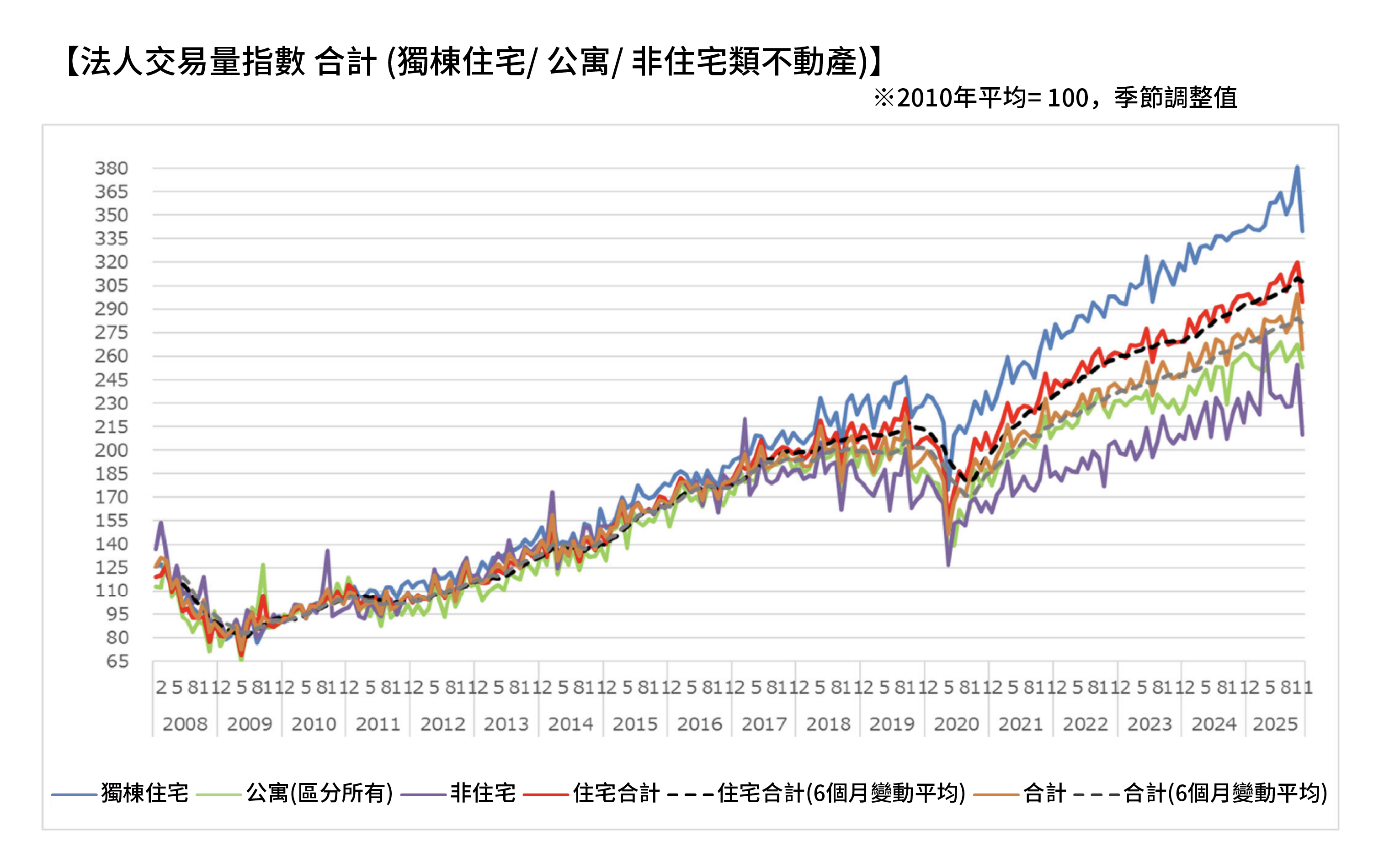 此外,法人不動產交易也出現暫時性下降。法人交易量指數顯示,投資人在短期內轉為較為審慎。